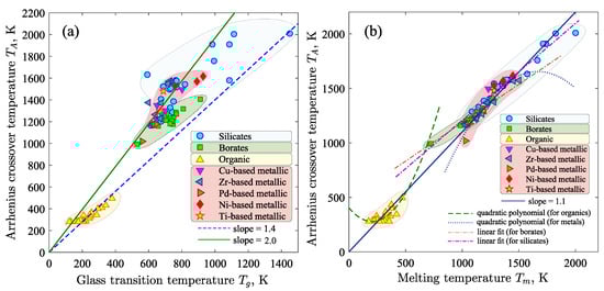 Figure 3a shows the correspondence between the glass transition temperature and the predicted temperature for various glass-forming liquids. For organic compounds, the correspondence between and is reproduced according to the linear law with . It is noteworthy that this correspondence between and was predicted earlier (for example, see Refs. [8,34]). For metallic glass formers, there is a relationship between and of the form , where . As a rule, such a relationship between temperatures and is universal for metal alloys containing two to five different components [8]. For silicates and borates, there is no clear correlation between and : the known laws do not reproduce the correspondence between and . The results given in Figure 3b reveal the obvious correlation between and for silicates and borates, whereas variation in values of these temperatures is more pronounced for organic and metallic glass formers. Despite this, the correspondence between and is reproduced by the linear law regardless of the type of glass-forming liquid.