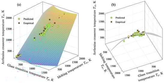 (a) Correspondence between the Arrhenius crossover temperature (), the melting temperature () and the glass transition temperature (). Circle and square markers denote predicted and empirical data, respectively. These data are compared with the results of Equation (11), which are presented as a curved surface. (b) This figure is from an another foreshortening, which allows one to consider the curved surface.