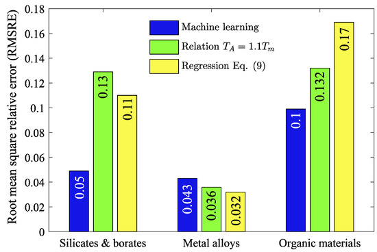 where is the empirical value of ; is the computed by various methods—a machine learning model, by relationship (8) and by Equation (11). Figure 5 shows that the accuracy at estimation of depends on the applied method and the category of material. Thus, for silicates and borates, the error of machine learning prediction is lower than that of other methods. In this case, Equation (11) is more accurate than relationship (8). For metallic systems, the errors of all methods are comparable, although Equation (11) produces the smallest error. For organic materials, the machine learning prediction is more accurate than other methods. In this case, the error of Equation (11) is higher than the error of relationship (8). This is due to the fact that for materials with complex structures, such as organic materials, the glass transition temperature is determined ambiguously. Namely, for this category of materials, the temperature in relation to the melting temperature can vary widely compared to silicate, borate and metallic systems. For example, for organic materials, the variation in exceeds , whereas for borate, silicate and metallic systems this variation is usually less than .