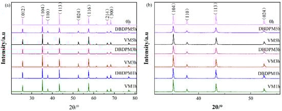Figure 1 shows the XRD patterns of the Al2O3 powder after different milling times. It can be seen that, with the extension of ball milling time, the broadening and dwarfing of Al2O3 diffraction peaks occur for both ball milling methods. Table 2 provides the full width at half maxima (FWHM) of the Al2O3 powder after different milling times. It can be seen that the FWHM increases with the increase in time, and the FWHM of Al2O3 after DBDPM is greater than that after VM. However, the crystal form of Al2O3 does not change and is still rhombohedral, as shown in Table 3. The broadening of diffraction peaks is mainly due to the linear broadening caused by stress release during grain refinement and the linear broadening caused by microscopic distortion.