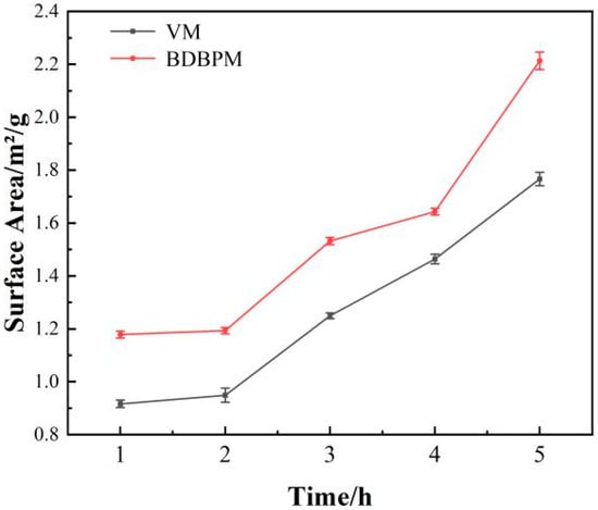 Table 4 presents a comparison between the particle sizes of the Al2O3 powder after different milling times. After the same ball milling time, it can be seen that the particle size (D10, D50 and D90) of the Al2O3 powder after DBDPM is smaller than that after VM. The particle size difference in D50 and D90 of the Al2O3 powder prepared with the two ball milling methods after the same milling time is about 1.2~1.5 µm and 0.4~0.7 µm, respectively, and the D50 particle size of the Al2O3 powder reaches 1.43 µm after 5 h of DBDPM. Figure 2 shows the specific surface area of the alumina powder after various milling times. The specific surface area of the alumina powder increases with the increasing milling time. Moreover, at the same ball milling time, the specific surface area of alumina powder after DBDPM is larger than that after VM. The specific surface area of the alumina powder after DBDPM and VM reached 2.2 m2/g and 1.76 m2/g, respectively, after 5 h of ball milling.
