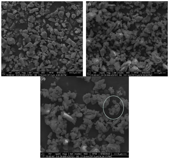 Figure 4 provides the microstructure of Al2O3 powder after DBDPM for different amounts of time. The powder becomes finer with increasing ball milling time. The particle size of the alumina powder was approximately 3 µm after 3 h of ball milling. After 5 h of DBDPM, the average particle size decreased to around 1.5 µm, and the particle size was distributed mainly in the range of 500 nm~2 μm. However, some large bulks, with a size of about 5 µm, were observed (as shown in the circles in Figure 4e). This is because the powders are in an unstable state during the ball-milling process. Moreover, under the action of electrostatic attraction and van der Waals forces, the particles flock together spontaneously, thus reducing the enthalpy of the system and forming a soft agglomeration composed of secondary particles. Due to the action of high-energy electrons and active species, the agglomeration of DBDPM-milled powder is easier to occur than in VM-milled powder.