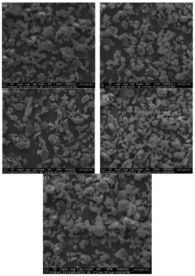 SEM images of Al2O3 powder after different times of VM: (a) 1 h; (b) 2 h; (c) 3 h; (d) 4 h; and (e) 5 h.