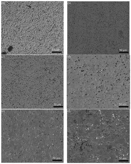 Polished surfaces of Al2O3 ceramics fabricated from various alumina powders: (a) VM 1 h; (b) VM 3 h; (c) VM 5 h; (d) DBDPM 1 h; (e) DBDPM 3 h; and (f) DBDPM 5 h.