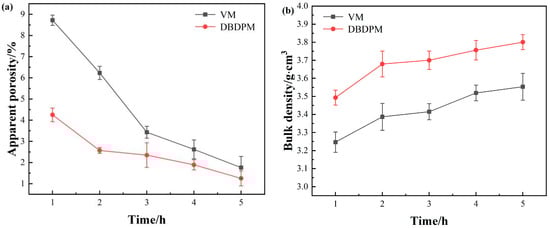 The sintering properties of the Al2O3 ceramics fabricated from various alumina powders are shown in Figure 8. With an increasing milling time, the porosity of alumina ceramics decreases, while the bulk density increases. After the same ball milling time, the alumina ceramics prepared via DBDPM possess remarkably lower apparent porosity and significantly higher bulk density than that of the alumina ceramics fabricated from VM-milled powders. Because of the high-density and high-energy plasma bombardment in DBDPM, the method produces a great impact force and thermal effect on the surface of a powder. Moreover, it also leads to the local evaporation or melting of the material sputtering behavior. The vaporized components condense when they encounter other powder particles with lower temperatures, forming a large number of small primary particles on the surfaces of those particles. The highly active particles of the ionized body (ions, electrons, excited atoms and molecules, free radicals, etc.) are easy to adsorb with other substances and increase the activity of the material surface. The fresh surface and a large number of defects introduced by the ball mill further enhance the activity of the milled powder, making diffusion, phase transition and chemical reactions easier to occur. Therefore, in the sintering process, the alumina ceramics fabricated from DBDPM-milled powders were much denser than the alumina ceramics fabricated from VM-milled powders.