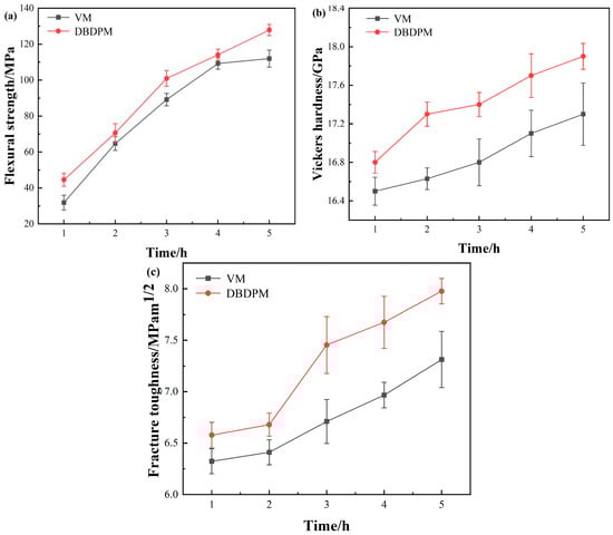 Figure 9 shows the flexural strength, Vickers hardness and fracture toughness of Al2O3 ceramics fabricated from various alumina powders. Compared with the VM-milled powders, the flexural strength, Vickers hardness and fracture toughness of alumina ceramic prepared from DBDPM-milled powders were slightly improved. After ball milling for 5 h, the alumina ceramic prepared from DBDPM-milled powders showed a 23 MPa higher flexural strength, a 0.7 GPa higher Vickers hardness and a 0.8 MPa m1/2 greater fracture toughness. This may be due to the smaller grain size of alumina ceramic (Figure 7) and the higher activity of alumina powder from DBDPM, thus promoting the density of sintering (Figure 8).