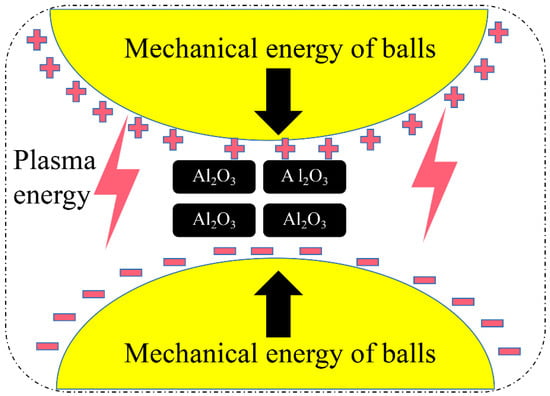 In DBDPM, 0.1 MPa Ar gas is filled in the ball mill jar. When dielectric barrier discharge is implemented, a large number of charged particles in a high-energy state and optical radiation are generated in the dissociated Ar atmosphere []. These particles with high energy and high density collide and bombard the surface of the powder. When the excited particles with tens of electron volts bombard the powder surface, the incident particles and lattice atoms cause a series of collisions in the solid surface layer, which lead to the vibration or movement of lattice atoms. These energetic particles may be compounded by the surface of the powder or injected into the surface to transfer their kinetic energy to the lattice atoms. With an increase in DBDPM milling time, the density of incident particles on the Al2O3 powder increases, and a large number of lattice atoms in the crystal are in an unstable state. At the same time, the increase in the internal energy storage of the Al2O3 powder with dielectric properties leads to a sharp rise in powder temperature and even local melting. When the molten or semi-molten Al2O3 powder is frequently shear impacted by the steel ball at a low temperature, huge thermal stress is generated, which can be expressed as