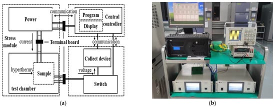 DC/PDC electromigration test system. (a) Schematic diagram of test system; (b) Electromigration test system.