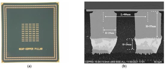 Cu Pillar/Ni/Sn-1.8 Ag/Cu micro-interconnect test chips with a daisy-chain structure were designed and fabricated. Optical microscopy and scanning electron microscopy (SEM) images of the test sample are shown in Figure 2. The radius and height of the Cu pillar are 25 μm and 55 μm, respectively. The Ni layer has a thickness of approximately 2 μm, the size of the solder is approximately 20 μm, and the interconnection pitch of Cu bumps is 80 μm. The bare chips were first welded to the substrate, and then filling and plastic sealing operations were conducted to form the test chips. After the test, epoxy resin was used to seal the daisy chain structure samples, and after sandpaper grinding, Al powder polishing, and etching, the scanning electron microscope was used to observe the micromorphology.