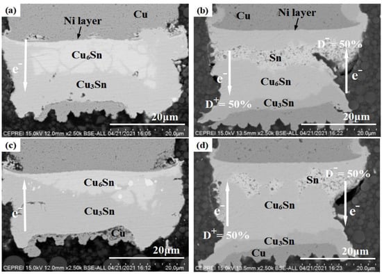 As shown in Figure 4a,c, the lead-free solder has been alloyed completely to form Cu6Sn5 and Cu3Sn layers under DC stress. The cathodic Ni layer in Figure 4a shows localized dissolution and depletion in several places. In contrast, the anodic Ni layer in Figure 4c still maintains its complete layered morphology, isolating the Cu pillar from direct contact with the solder. As electrons migrate from the cathodic Ni layer to the anodic Cu pad sides in Figure 4a, the electron wind will drive Ni to dissolve continuously into Sn-1.8 Ag solder [24]. Without the protection of the Ni layer, the Cu pillar will react with the solder. This process consumes plenty of Sn atoms, effectively slowing down the consumption of Cu pads on the anode sides. The degree of anodic Cu pad depletion is thus significantly greater in Figure 4c than that in Figure 4a.