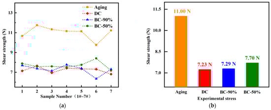 Shear strength of solder joint interconnections under different experimental stresses. (a) Shear strength statistics. (b) Average shear strength.