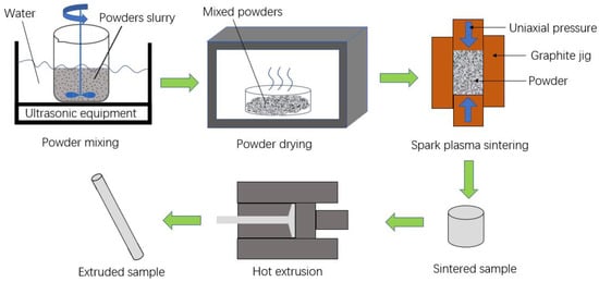 At present, magnesium matrix composites are often prepared by stir casting and powder metallurgy methods. There are some problems in the stir casting method, such as serious settlement and the uneven distribution of reinforced particles []. The powder metallurgy method can distribute the reinforced particles evenly in the Mg matrix []. To further improve the mechanical properties of magnesium matrix composites, secondary processing techniques such as hot extrusion have been widely applied to magnesium matrix composites prepared by powder metallurgy []. Therefore, magnesium matrix composites prepared by powder metallurgy are usually hot-extruded to obtain the expected mechanical properties.