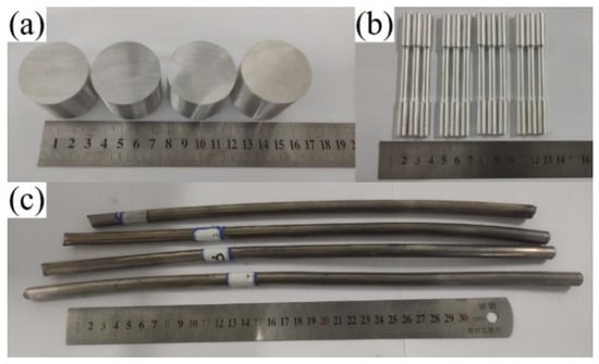 Experimental samples of (a) sintered samples, (b) tensile test samples obtained by mechanical processing of extruded samples, and (c) extruded samples.
