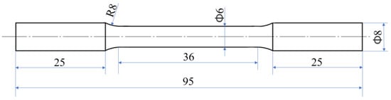 All tensile specimens were machined parallel to the extrusion direction; the tensile test samples are shown in Figure 4b, and the specific shape and size of tensile test samples are shown in Figure 5. The tensile test of the TC4/AZ31 composites at room temperature was carried out on a universal test machine (CMT5105). To ensure the accuracy of the experimental data, three samples were used for each material, using the GB/T228.1-2021 standard and under the same conditions to obtain the average tensile data (YS, UTS, and FS) of each set of experiments.