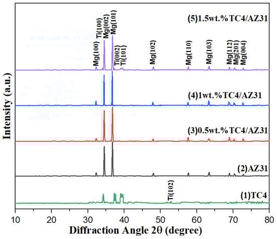 Figure 6 shows the X-ray diffraction patterns of TC4, AZ31, 0.5 wt.%TC4/AZ31, 1 wt.%TC4/AZ31, and 1.5 wt.%TC4/AZ31 composites. It is obvious from the figure that the peaks of TC4 appear at 2θ equal to 34.26°, 37.62°, 39.66°, and 52.88°. Different phases of magnesium can be observed at 2θ equal to 32.28°, 34.52°, 36.78°, 48.06°, 57.68°, 63.38°, 69.02°, 70.38°, and 72.82°; compared with the JCPDS of magnesium, the overall peak shifted to the right by approximately 0.2°, but this did not affect the results of the experiment. The addition of nano-TC4 produced new peaks at 2θ equal to 34.08°, 37.28°, and 39.62°, which confirmed the presence of nano-TC4 in the composites. The diffraction peak of TC4/AZ31 composites did not shift with the increase in TC4 content; this was due to the low content and small size of nano-TC4 particles, and only a weak titanium peak appeared in the XRD pattern of the composites.