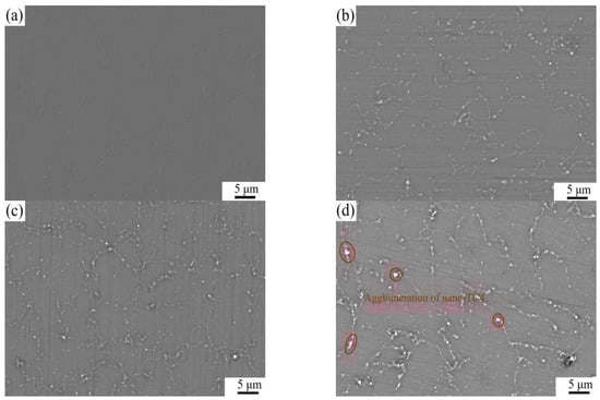 Figure 7 shows the SEM microstructures of as-extruded TC4/AZ31 composites. In Figure 7b,c, nano-TC4 particles are uniformly dispersed in the AZ31 matrix. However, in the 1.5 wt.%TC4/AZ31 composite, nano-TC4 aggregates at the boundaries of particles, as shown in Figure 7d. In the process of material preparation, the interaction between the nanoparticles is inevitable. The nanoparticles have huge surface energy and the spacing between the particles is extremely short []; under these circumstances, the weaker forces, such as van der Waals forces, electrostatic attraction, and capillary forces, become more and more prominent, which leads to the agglomeration of TC4 nanoparticles in the composites []. The agglomeration of nano-TC4 not only hinders the grain refinement of the magnesium matrix but also tends to produce defects in the deformation process, which ultimately leads to the deterioration of the mechanical properties.