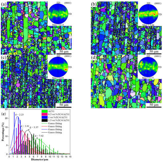 Crystal orientation mapping and macrotexture of (a) AZ31, (b) 0.5 wt.%TC4/AZ31, (c) 1 wt.%TC4/AZ31, and (d) 1.5 wt.%TC4/AZ31 as-extruded composites; (e) grain size distribution statistics.