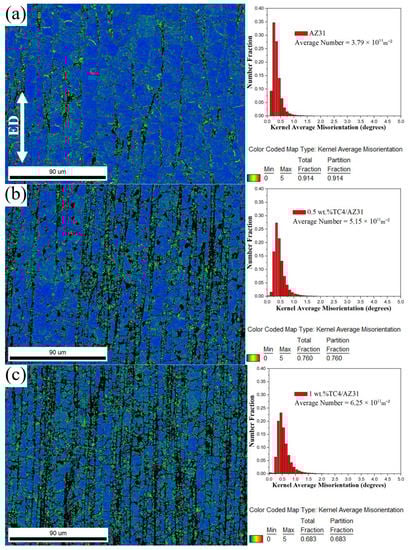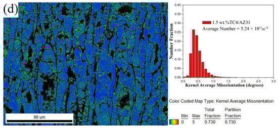 Figure 9 shows the KAM map and KAM value distribution chart of as-extruded TC4/AZ31 composites. To study the evolution of the dislocation density, the kernel average misorientation (KAM) method was used []. Using EBSD orientation data to determine the local misorientation angle, we studied the variation in local crystal orientation on the surfaces of composites with different TC4 content. As shown in Figure 9c, the dislocation is clustered around the reinforcement at the boundary of the magnesium particle, which confirms that the misfit stress occurs between the magnesium matrix and the reinforcement particles, leading to the increase in dislocation density in this location. With the increase in nano-TC4 content, the density of geometrically necessary dislocation (GND) increases from 3.79 × 1011 m−2 for the AZ31 alloy to 6.25 × 1011 m−2 for the 1 wt.%TC4/AZ31 composites; the higher the dislocation density, the more dislocations need to slip simultaneously per unit area, and this increases the force required for the composite to deform, which has a positive effect on the improvement in the strength of the composite material []. However, with the further increase in nano-TC4 content, the GND decreases to 5.24 × 1011 m−2 for 1.5 wt.%TC4/AZ31 composites, which is mainly caused by the agglomeration of nano-TC4 particles.