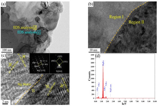 Figure 10 shows the interface structure of the as-extruded 1 wt.%TC4/AZ31 composite. The interface analysis between TC4 and the magnesium matrix is shown in Figure 10c; by measuring its lattice fringes and analyzing the diffraction spots, region I and region II were determined to be Mg and Ti, respectively. Figure 10d,e show the EDS analysis of regions d and e in Figure 10a; its results show that region d is the AZ31 matrix, and region e is the inclusion of the magnesium matrix and TC4. Ye et al. [] obtained 6 wt.%Ti/AZ31 composites by smelting at 630 ℃ and found TiAl and Al2Ti at the interface of magnesium and titanium, which had a positive impact on the interface bonding strength. Luo et al. [] obtained 5 wt.%TC4/AZ91 composites by powder metallurgy and found Al3Ti at the interface of magnesium and titanium, which had a positive impact on the mechanical properties. In this study, no other phases were found at the interface between TC4 and the magnesium matrix, which was related to the low sintering temperature and short sintering time of the composite.