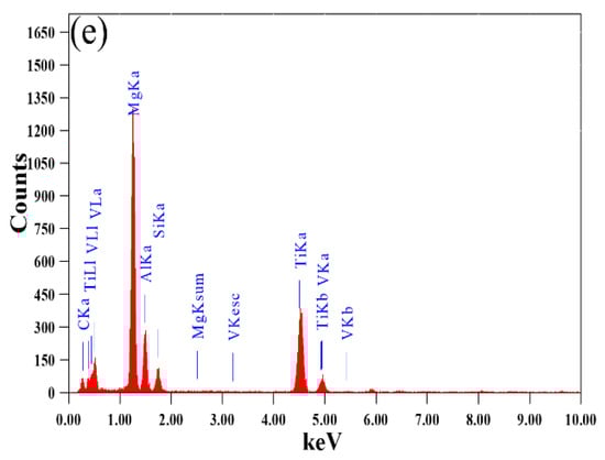 Figure 13a shows the tensile fracture image of the AZ31 alloy; the fracture shows cleavage and quasi-cleavage, and there are some cracks and a few dimples. The fracture mechanism is a mainly brittle fracture; this is due to the HCP structure of the magnesium matrix, and its plasticity is poor []. With the increase in nano-TC4 content, as shown in Figure 13b,c, the number of dimples increased and the number of cracks decreased and became less obvious. The increase in dimples means that the plasticity of the material is improved, and the decrease in cracks means that the crack propagation is delayed or even prevented [], which also means that the plasticity of the material is improved. This is consistent with the tensile test results of the composite. With the further increase in nano-TC4 content, the fracture of the 1.5 wt.%TC4/AZ31 composite is as shown in Figure 13d. The number of dimples decreased significantly and became less obvious; this is a deterioration in the plasticity of the material, and it is also consistent with the tensile test results.