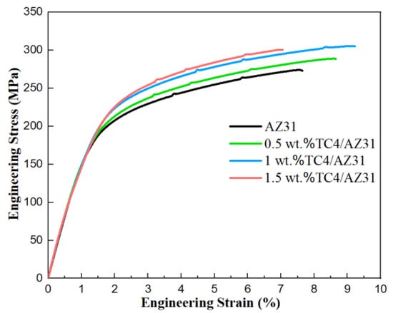 Stress–strain curves of as-extruded TC4/AZ31 composites in tensile tests.