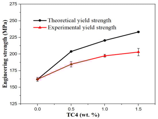 The theoretical YS of the composite is shown in Figure 12; the theoretical and experimental YS of TC4/AZ31 composites increase with the increase in nano-TC4 content. The experimental YS is always smaller than the theoretical YS, and the gap becomes wider with the increase in nano-TC4 content. This is because the theoretical calculation is based on the completely uniform dispersion of nano-TC4 in the Mg matrix. In practice, nano-TC4 forms aggregates in the matrix, and the more TC4 content there is, the easier it is to form aggregates. Therefore, the experimental YS is smaller than the theoretical YS, and the gap increases with the increase in TC4 content.