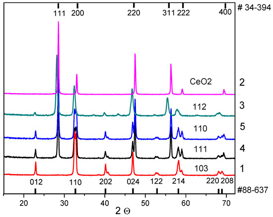 - Gorbunova, V.A.; Sliapniova, L.M.; Gorbunov, A.V. Thermochemical Preparation and Properties of Low-Cost Polylanthanide Manganite Materials of Ln(La, Ce, Nd, Pr)xCayMnO3-Type with Perovskite-Fluorite Structure. Sci. Tech. 2020, 19, 528–535. (In Russian) [Google Scholar]