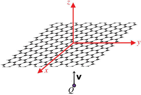 Schematic showing the situation we consider in this work, with the point charge Q approaching the graphene sheet on a normal trajectory (which we take to be along the z-axis) at constant velocity .