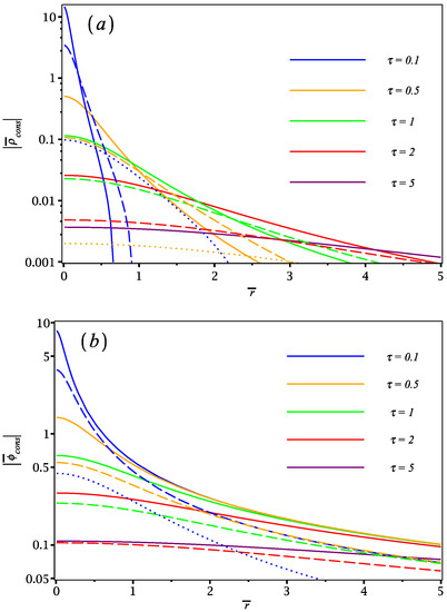Using (26) and (25) with (51) where , we computed the conservative parts of the induced charge density and the induced potential in the plane, which are shown in Figure 3 in reduced form, and , as functions of the reduced radial distance and the reduced time at several speeds () for several time points in the interval (recall that and are even functions of time). One notices that the induced charge density decreases in magnitude and spreads out radially with increasing time and with increasing speed. Interestingly, its time dependence implies that there exists an approximate scaling with at radial distances . This may be traced to the adiabatic limit of a quasistatic point charge Q a distance z away from a perfectly conducting plane [31], giving an upper bound to the curves shown in Figure 3a for each combination of the and parameters with fixed product . One notices in Figure 3b that the induced potential decreases in magnitude with increasing time and with increasing speed. The radial spread of the curves also decreases with increasing sped but, interestingly, the curves at different times with fixed speed tend to group together at large radial distances.