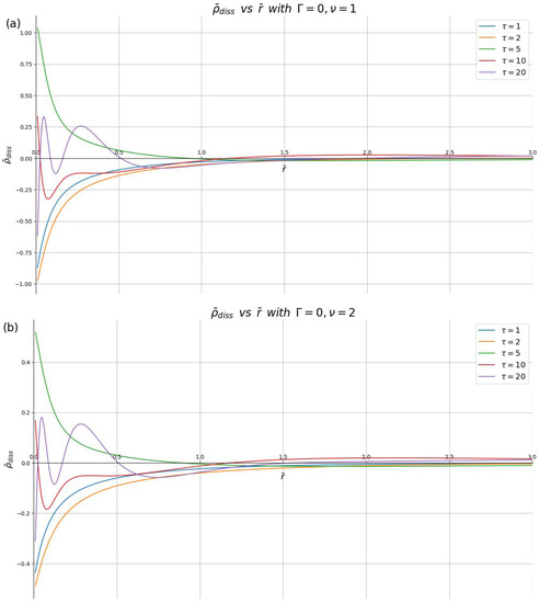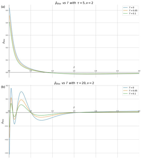 Dissipative part of the induced charge density, , shown in reduced units against the dimensionless radial distance for different damping parameters () with the reduced speed , and the reduced times: (a) and (b) .