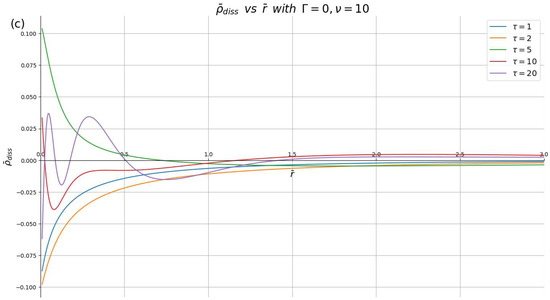 Dissipative part of the induced charge density, , shown in reduced units against the dimensionless radial distance for different dimensionless times (), with the damping parameter and the reduced speeds: (a) , (b) and (c) .
