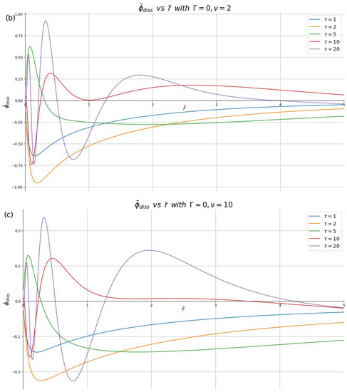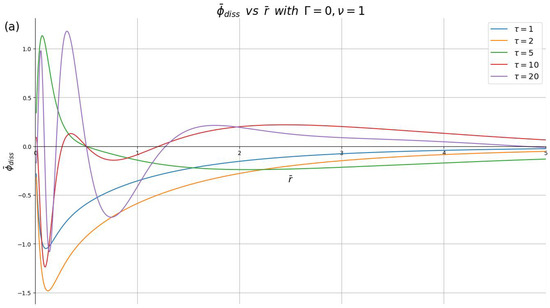 To carry out the numerical integrals in (25) and (26) using (53) and (55) efficiently is a nontrivial computational problem because of the oscillations in the Bessel function and the trigonometric functions in (53). We were able to adapt numerical methods from [48] based on the Hankel transform to carry out these integrations far more efficiently than was previously possible. This allowed for plots and animations of the dissipative parts of the induced charge density and the induced potential in the z-plane, which will be shown in the spatiotemporal domain in a dimensionless form, and , as functions of the reduced radial distance from the point of impact and the reduced time .