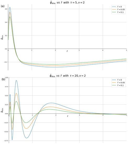 Dissipative part of the induced potential, in the plane , shown in reduced units against the dimensionless radial distance for different damping parameters () with the reduced speed , and the reduced times: (a) and (b) .