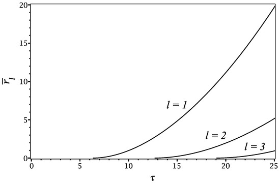 Evolution of the radial position of the ℓth wave crest in reduced units as a function of the reduced time based on the stationary phase method using the plasmon dispersion (49).
