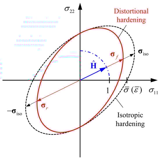 The yield function consists of a stable component and a fluctuating component . Any yield function may be used as the stable component after being reduced to a homogeneous function of degree 1 with the form of . is a hardening law, where and are the equivalent stress and equivalent plastic strain, respectively. and are state variables related to deformation history leading to the distortion of the yield surface, and q is a constant exponent. If , Equation (1) reduces to a conventional yield function, .