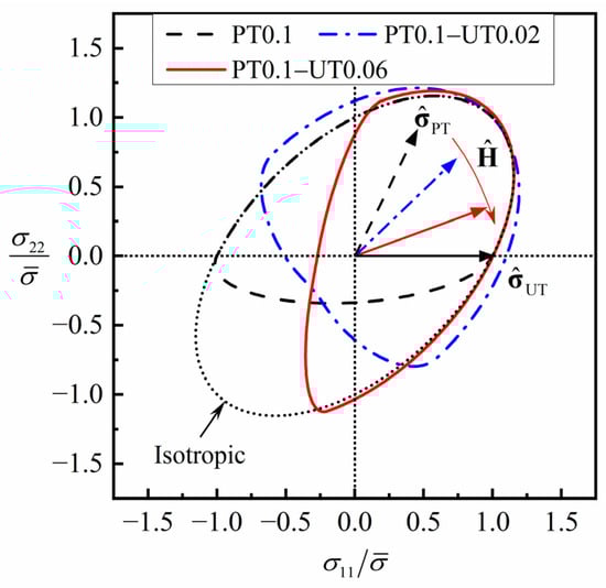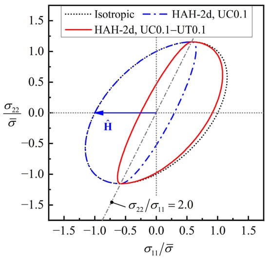 The evolution of the normalized yield locus of the generic material, predicted by the HAH-2d model under a reverse loading, namely, uniaxial compression (UC) to true strain of 0.10, followed by uniaxial tension (UT) in the reverse direction, is shown in Figure 4. The microstructure vector maintains (−1, 0, 0) during the whole deformation. The normalized yield loci in plane are divided into left and right sides by the line . This line is chosen because the two stress deviators corresponding to stress vectors and are orthogonal. During the compression step, the yield locus on the left side remains unchanged, while the yield locus on the right side contracts inward, which will result in a reduction in re-loading yield stress when tension occurs in the opposite direction. As the tensile strain increases in the second step, the yield locus on the left side contracts inward instead. The yield locus on the right side recovers towards the isotropic hardening yield, but not completely, because of the permanent softening effect.