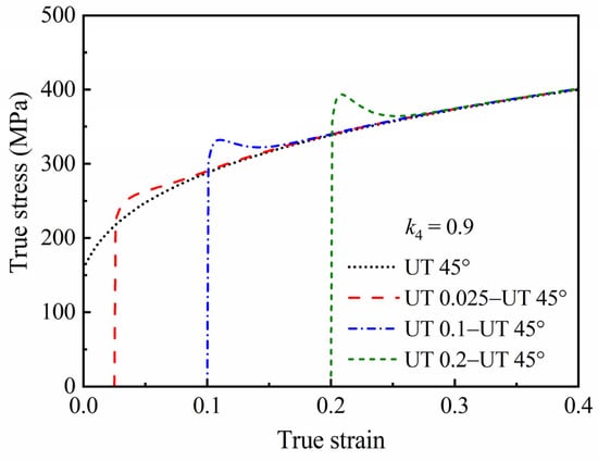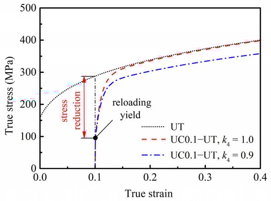 The predicted stress–strain curve during reverse loading is given in Figure 5. The reloading yield stress after compression pre-deformation is significantly lower than the monotonic flow stress under the same deformation level, which is the Bauschinger effect. When k4 = 0.9, the stress will not reach the monotonic uniaxial tensile curve, which is the permanent softening effect. Additionally, the permanent softening phenomenon disappears when k4 = 1.0. Therefore, the HAH-2d model can describe the Bauschinger effect and permanent softening effect during reverse loading.
