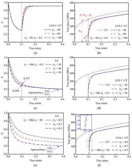 Predicted responses of the Bauschinger effect during reverse loading; evaluation of g1 during (a) UC0.1−UT loading under different k1; (c) UC loading under different k2; and (e) UC loading under different k3; and stress–strain curves during UC0.1−UT loading under (b) different k1; (d) different k2 and (f) different k3.