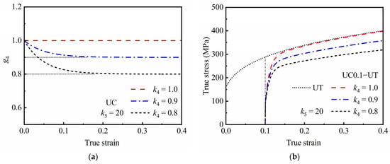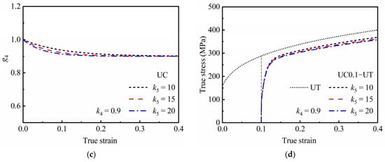 Predicted responses of permanent softening effect during reverse loading; evaluation of g4 during UC loading under (a) different k4 and (c) different k5; and stress–strain curves during UC0.1−UT loading under (b) different k4 and (d) different k5.
