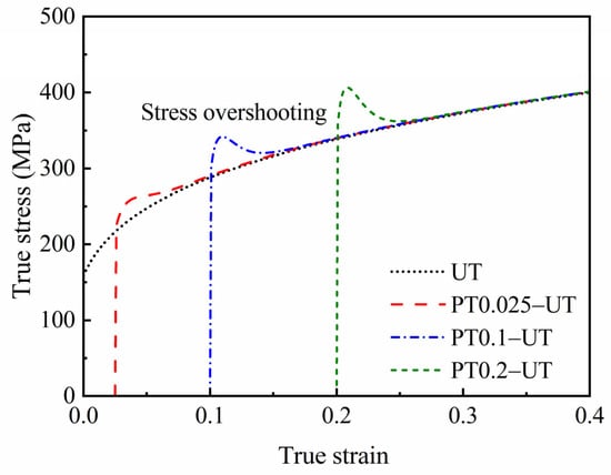 The Bauschinger effect is the phenomenon wherein the yield stress under reverse loading decreases after a certain amount of pre-deformation [8,9]; the permanent softening effect is another phenomenon during reverse loading wherein the reloading flow stress remains lower than the flow stress of monotonic loading [10]. Meanwhile, there is a wide range of strain path changes between monotonic loading and reverse loading. For some materials, the reloading flow stress at an angle with respect to the first loading may overshoot the monotonic stress–strain curve; this phenomenon is referred to the latent hardening effect [11,12].
