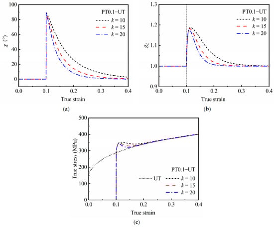 Predicted responses of latent hardening effect during cross loading of PT0.1−UT under different k: (a) evaluation of χ, (b) evaluation of gL and (c) stress–strain curves.