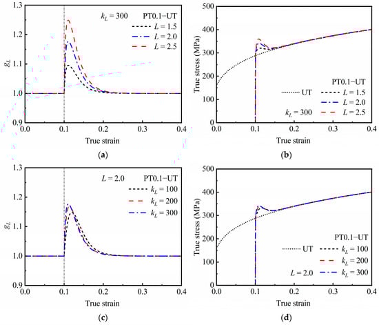 Predicted responses of latent hardening effect during cross loading of PT0.1−UT; evaluation of gL under (a) different L and (c) different kL; and stress–strain curves under (b) different L and (d) different kL.