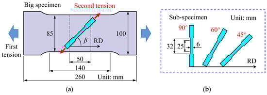 Schematic illustration of the specimens used in the two-step uniaxial tension tests: (a) the sub-specimen at the center of the big-specimen and (b) directions of the second tension [6].