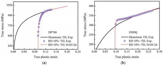 The coefficients associated with the distortion of the HAH-2d model for each material were identified with an optimization method using the stress–strain data from an orthogonal two-step tensile test with 10% pre-strain in RD, as shown in Figure 15. In the optimization method, the objective is to minimize the RMSE. Considering that the DP780 steel expresses no permanent softening and latent hardening, k4 = 1.0, k5 = 0, kL = 0 and L = 1.0 were set directly. Similarly, as the EDDQ steel expresses no permanent softening, k4 = 1.0 and k5 = 0 were set. In the meantime, the value of q was set to 2.0 for convenience. The obtained coefficients of the HAH-2d models for DP780 and EDDQ are listed in Table 3. Additionally, the predicted stress–strain curves are plotted in Figure 15a,b, both of which agree well with the experimental data. Additionally, the values of RMSE for DP780 and EDDQ are 9.81 and 1.85, respectively. Incidentally, the reason for using the experimental data from reference [27] in Figure 15 is that the experimental data used in reference [27] are also from reference [6], but more points are given for this testing condition.