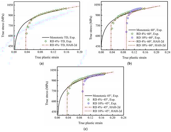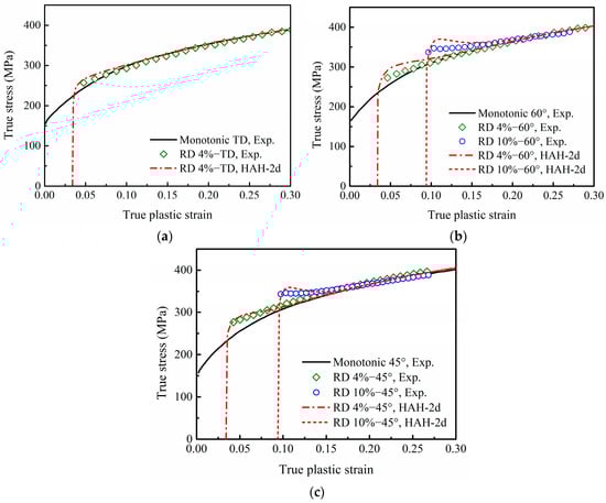The predicted stress–strain curves of the HAH-2d model for DP780 under different two-step uniaxial tensions are compared with the experimental curves in Figure 16, and the corresponding prediction errors are listed in Table 4. It can be seen from Figure 16a that the HAH-2d model captures the transient hardening behavior of DP780 fairly well for re-tension in TD after a 4% pre-strain in RD, and the AARE value is only 1.28%. However, the prediction at 60° shown in Figure 16b slightly overestimates the re-loading yield stress and leads to a lower hardening rate. As a result, the values of RMSE and AARE increase to 37.85 and 3.44% under the condition of 10% pre-strain. On the other hand, as shown in Figure 16c, the phenomenon of cross-loading softening was observed in re-loading stress–strain curves at 45°, but the predicted re-loading yield stresses at 45° reach the monotonic curve immediately. Additionally, the high RMSE values of 24.49 and 47.13 are mainly due to the significant difference between the predicted stress and the experimental stress at the beginning of the second tension.