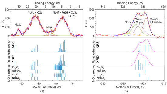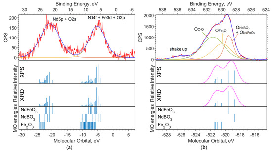 In Figure 1, a theoretical “spectrum” is plotted under the experimental survey spectrum. The intensity ratio for the XPS data “spectrum” lines is chosen in accordance with the concentrations—1:2:2 for Fe6O9:NdBO3:NdFeO3. The MO energies of the three model compounds are plotted under the theoretical “spectrum”. The overview spectrum is satisfactorily described by the concentrations according to the XPS and the XRD.
