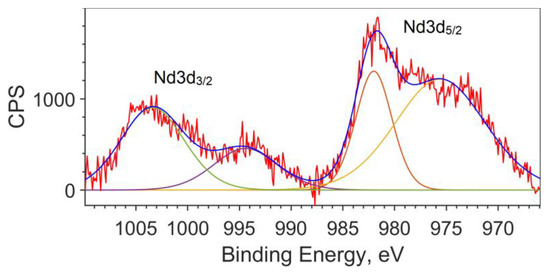 Since the calculation does not describe the spin–orbit interaction, the splitting of the Nd3d5/2 and Nd3d3/2 levels for the theoretical spectrum is taken from the XPS spectrum and equal to 22.4 eV (see Figure 3). The peak for Nd3d5/2 is found at a binding energy of 981.8 eV, and the peak for Nd3d3/2 is at an energy of 1004.2 eV.