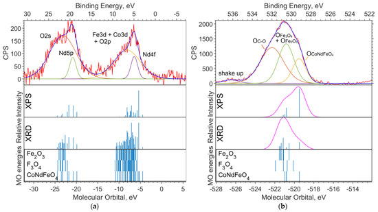 (a) XPS spectrum of the valence region and (b) spectrum of oxygen 1s levels for the NdFe(1−x)CoxB oxide powders with x = 0.5. The theoretical spectrum intensities based on the XPS (top) and the XRD (bottom) concentrations, and the MO energies of model compounds with Gaussian functions with a half-width FWMH = 1.5 eV are superimposed on the theoretical intensities on (b).
