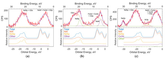 In the O1s spectrum (Figure 7b), a low-intensity part of the band in the region of 534–536 eV of the binding energy (scale is located at the top of the image) can be attributed to oxygen atoms being chemically bonded to boron. Oxygens bound with iron and cobalt in the Fe3O4 and Co3O4 oxides, respectively, and contribute to the region of 531–532 eV. The intense part of the band in the region of lower binding energies (529–530 eV) is occupied by neodymium-bound oxygens.