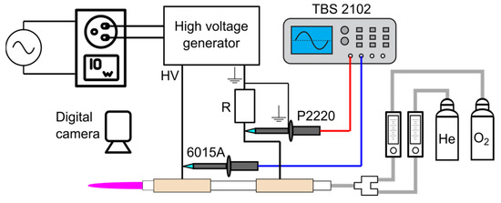 Helium and its mixture with oxygen were used for all experiments. During the tests, gases were fed through glass tube flow meters (Brooks Instrument SHO-RATE, Hatfield, PA, USA). The widest range of flow rates (0.32–5.8 L/min) was used in the study of the influence of the working gas on the shape of the discharge, which was carried out on the basis of the length of the glowing part of the plasma depicted on photos (Nikon D7000, Bratislava, Slovakia; 1/80 s exposure time) and known dimensions of reference points.